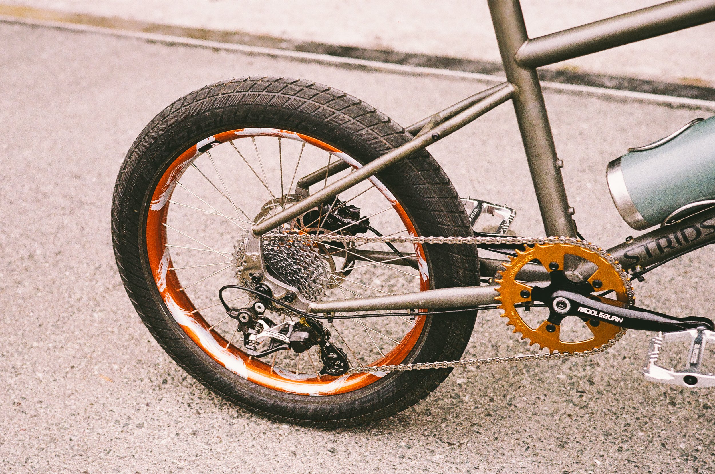 So naturally, this Boomboat prototype rolls on a pair of thicc Velocity Dually rims, finished in a wild custom anodized orange, detailed with brushed silver touches. Simply bold, slightly over the top, and perfectly in tune with this bike.