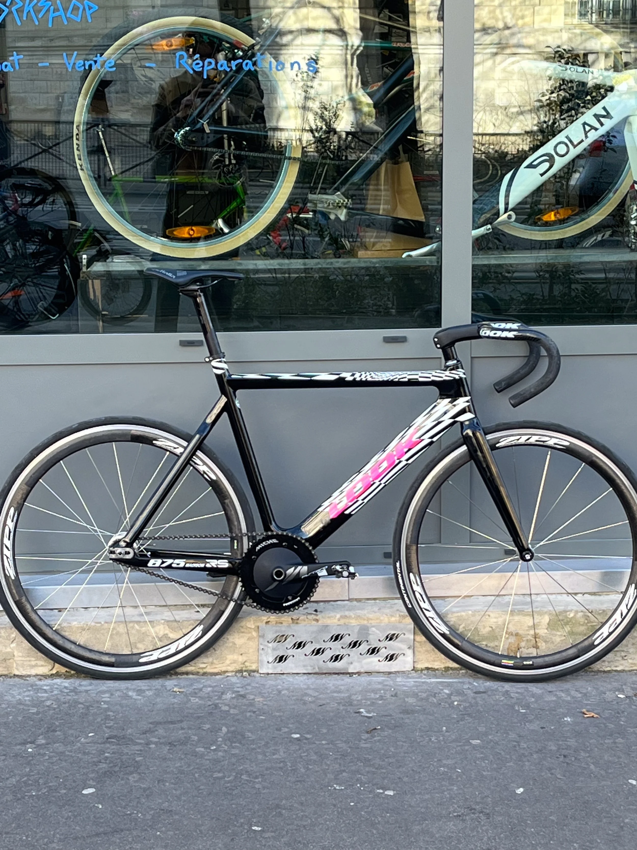 Versatile build, ready to shred both velodromes and Parisian streets, with its retro road Zipp's in carbon, engineered for performance yet compatible with a front brake when the city traffic gets to lethal, and with its x-track pedals, perfect for pushing hard on the track while staying cool at work with some Adidas Velosamba or whatever.
